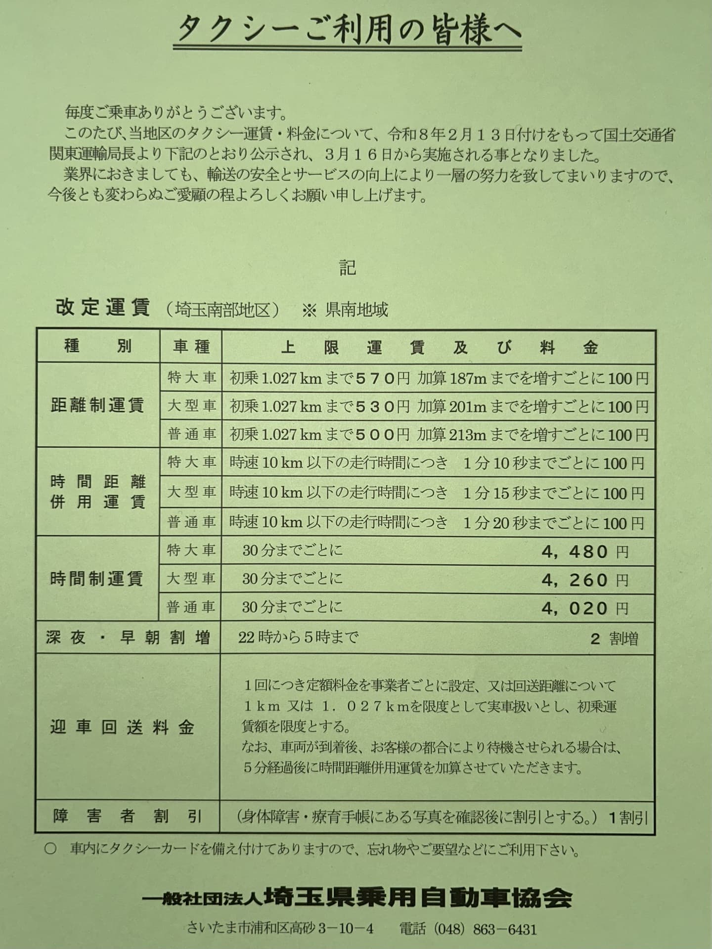 際、しばらくの間、迎車料金はサー